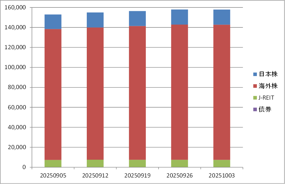 運用全体としては、今週は日本株、米国株が好調に推移したものの、REITが不調だったことに加え、為替レートがドル安になったことで円換算でのマイナス影響が大きかったことから、資産合計では運用額が減少しました。