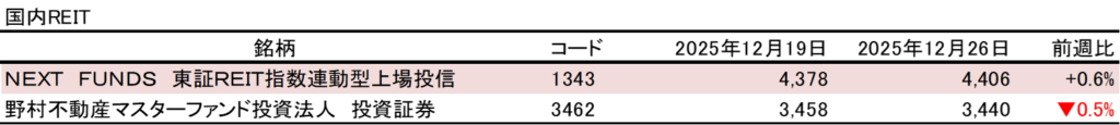 - 東証REIT指数:2026.66(前週比+0.6%)
