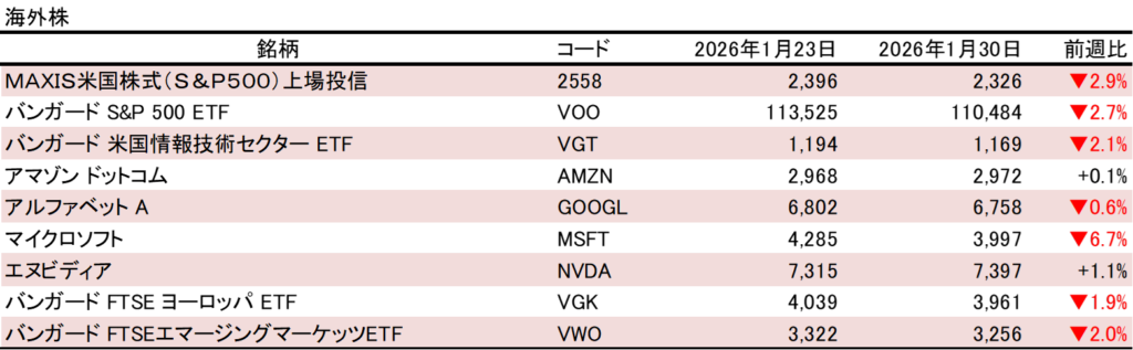 海外株は、主力のS&P500インデックスETFが続落しました。