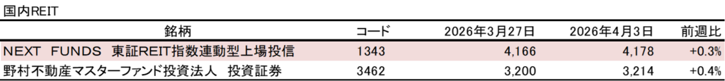 - 東証REIT指数:1894.40(前週比マイナス0.8%)