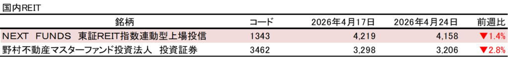 - 東証REIT指数:1901.62(前週比マイナス1.3%)